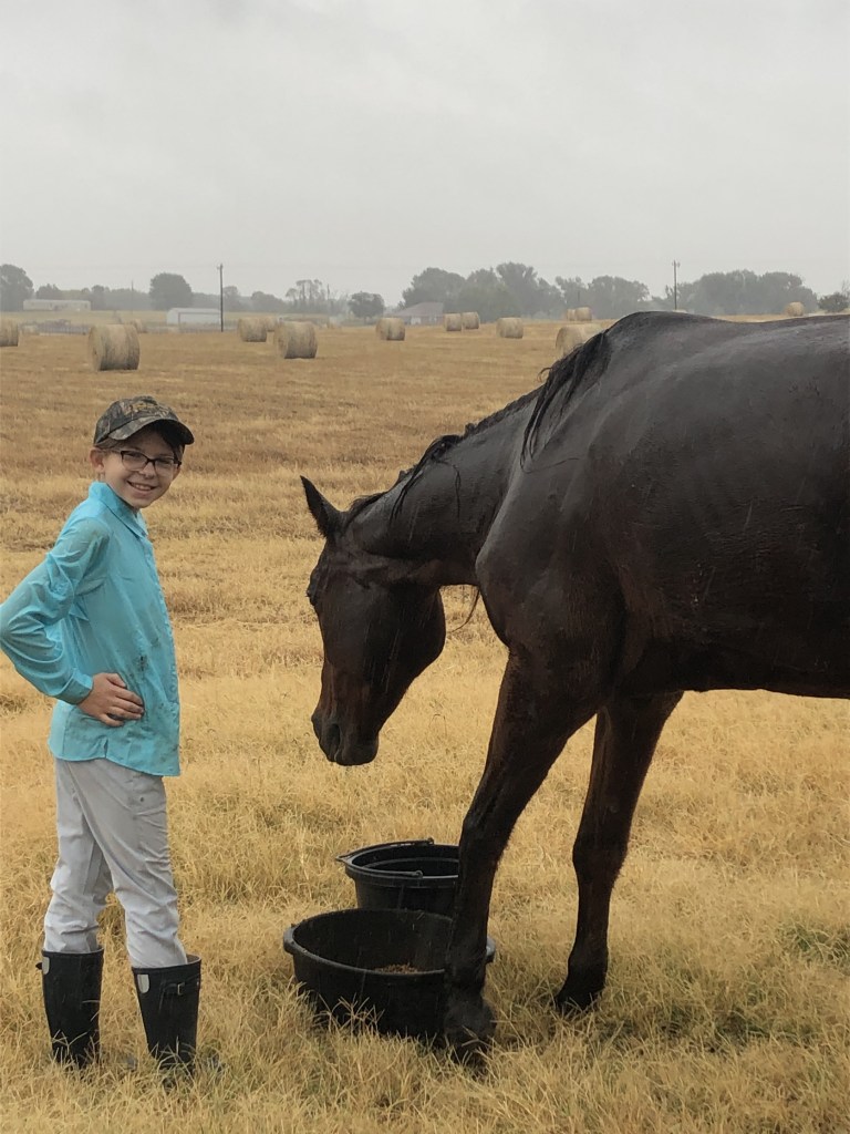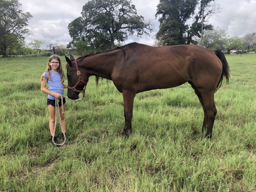 About a year ago, our family bought a ranch and soon after we got a go-cart. I was driving my mom and we saw a horse next to some cows by a tree through the neighbor’s fence. My mom said,“WAIT STOP!” At first I didn’t see the horse. Then I pressed the go pedal a little bit and I saw the horse. My mom said, “Maybe next time we come on the go-cart we could bring the horse an apple.” Later that month my mom and dad talked to the neighbors and they sold their ranch to us and let us keep the horse who was named Dancer. But they told us she was being fed once a week and that she was in the pasture full time just eating grass. When I finally got close to her she was so skinny I could see her ribs, her hair was matted and she walked like she was in pain. Just looking at her made me want to cry.