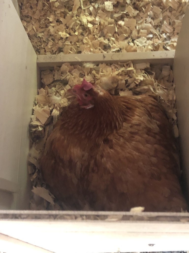 Debbie got up once from her eggs when I tried to take some pictures. She got up to go get her food which was outside of the coop but she went right back to sit on the eggs again. This time she faced the wall so she couldn’t see anyone and so that she would be alone. This made me and my mom laugh out loud!