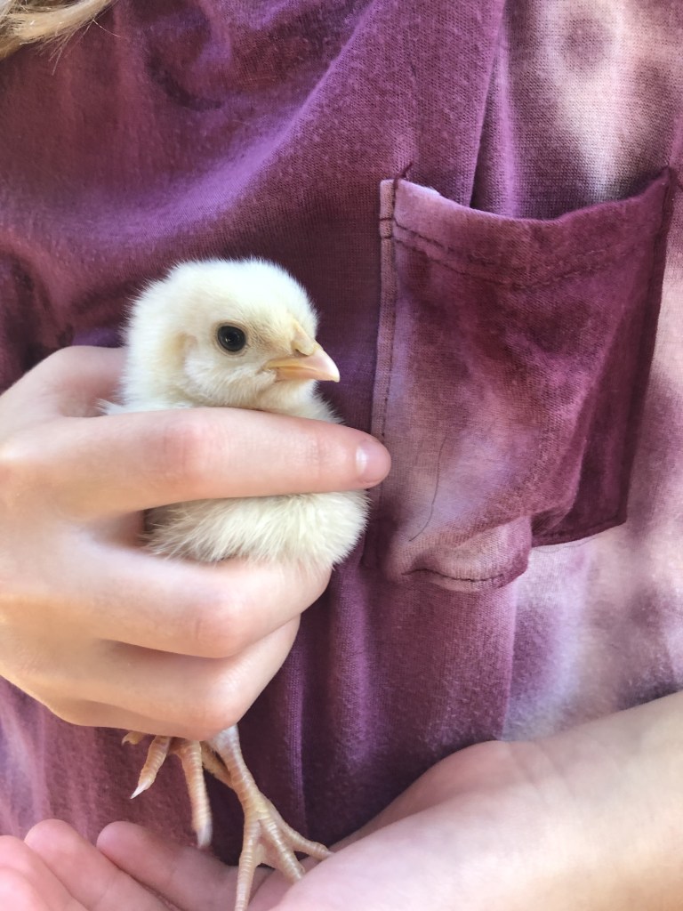 We went to feed the chickens and let them out of the coop. When we got there all of the chickens were there plus two baby chicks! There was one black chick and one yellow chick. Our brooding hen, Debbie, was off her nest. Debbie and her two hatched chicks were inside to coop rolling in the dirt and looking for bugs. It made me smile to see them playing around in the dirt but again something was off. There were supposed to be 20 eggs left in the nest but there were only nine. We looked around the coop and everything seemed fine. So we left the chickens outside of their coop and went to check on Dancer. When we got there Dancer was laying down on the grass in the sun sunbathing and resting her sore feet. When she saw us she stood up and I carried the food to her out of the ATV. The next door neighbor’s horses were there next to her so I gave them a treat and I gave Dancer four.
