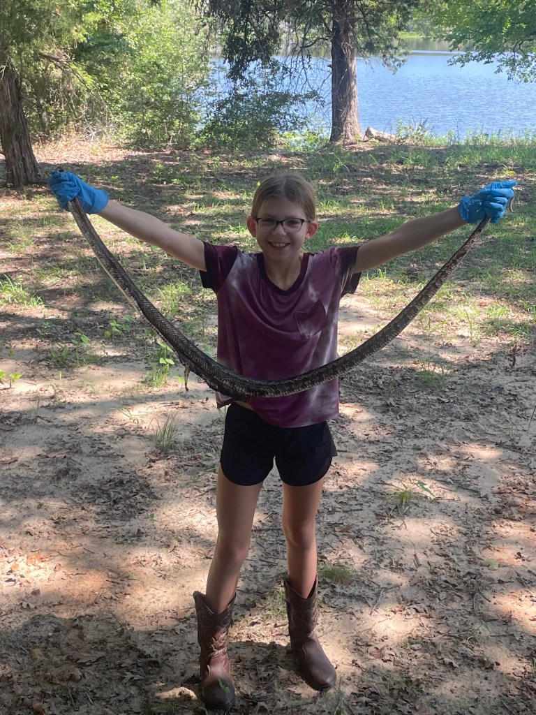 Debbie with her two chicks When we came back to put the chickens up into the coop, my uncle was back from town so I gave him a hug and said “hi”. My mom went back to the coop without me because I was talking to my uncle. A few moments later…. my mom came running from the coop and said there was a snake! Quickly I pulled on some boots and my uncle grabbed his gun and we ran out to the coop. My mom lifted the wooden pallet where the snake was hiding. My uncle said that the snake was a rat snake because of its brownish gray color. My uncle took care of the snake then moved the dead snake with a shovel. He picked it up and held it in front him and I couldn’t believe my eyes! The snake was longer than Uncle Jud!