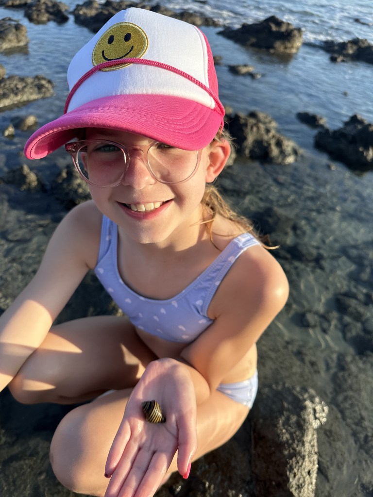 Ready for the beach! I was surprised when I saw black sand! It was hot for bare feet because the beach was dark. My dad, my sisters and I went down to swim while our mom walked on the beach. The water was chilly at first but it got warmer and eventually it felt normal. My dad rented a boogie board and Betsy and I shared it.