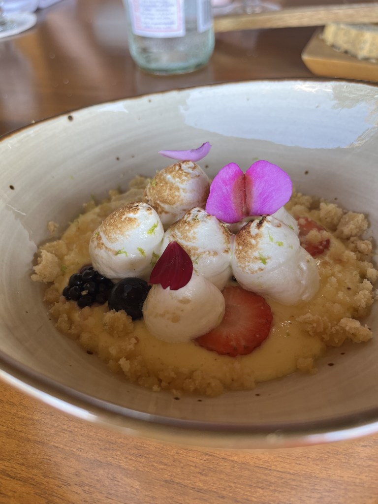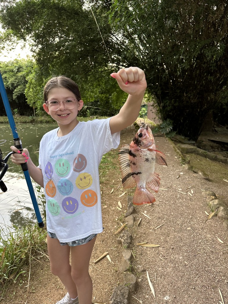 Key lime pie decorated with tropical flower petals A little later we went lagoon fishing and caught a lot of fish. There were three different types of fish in the lagoon: Rainbow Bass, Spotted Bass, and Tilapia! Betsy caught the most fish (six) and beat the resort record for how many fish you can catch in one hour. I caught five fish and Leigh caught three.