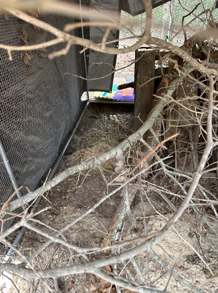 The Rio Grande turkey nest with six eggs in the turkey pen. Rios build nests on the ground in hidden locations. Our Rios made their nest in a hole that they dug and covered in hay