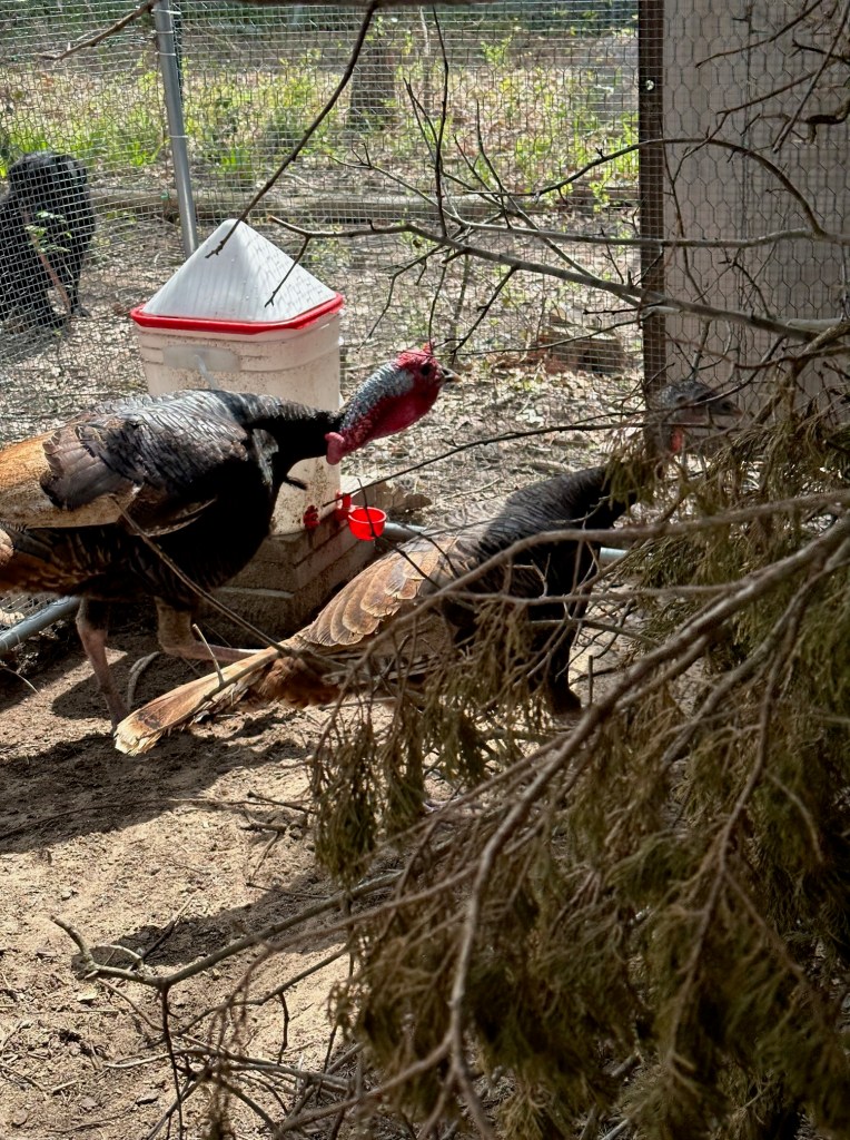 Smokey, who hatched in an incubator, next to the other turkey that we rescued from the turkey pen, Miley Spears.