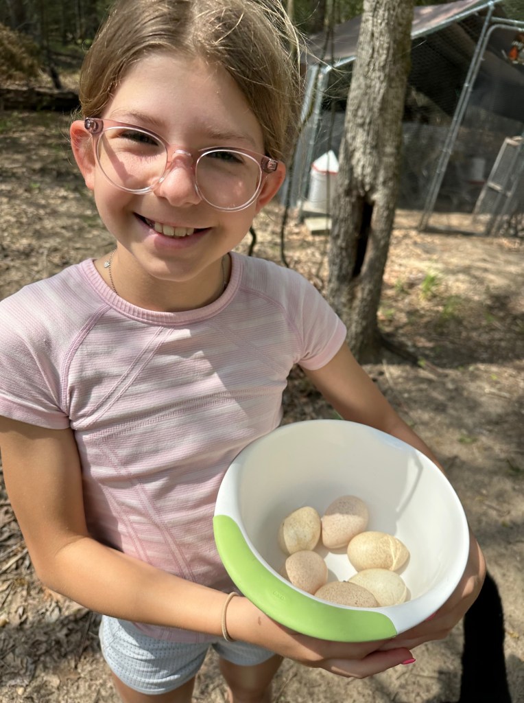 Amelia and me with the turtle Once we got to the other side of the property Amelia and I jumped out of Can-Am and ran towards the chicken coops. I could not believe my eyes! One of the bantam hens was running around the coop and the other one was with the bantam roosters in their tractor. It’s like they can’t make up their minds where they want to live! Amelia and I chased the hen that was out and finally I pinned her to the ground, took a deep breath and put her in with the other bantams. The chickens in the other coop were making a huge racket but when Amelia and I brought over some chicken scratch they quieted down. While all of the chickens were eating we grabbed their eggs from the nesting boxes. The bantams had laid ten eggs while cash had laid three.