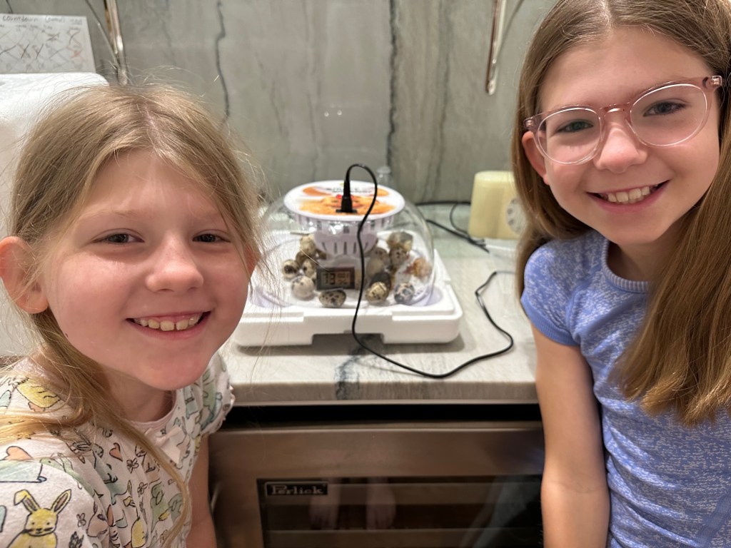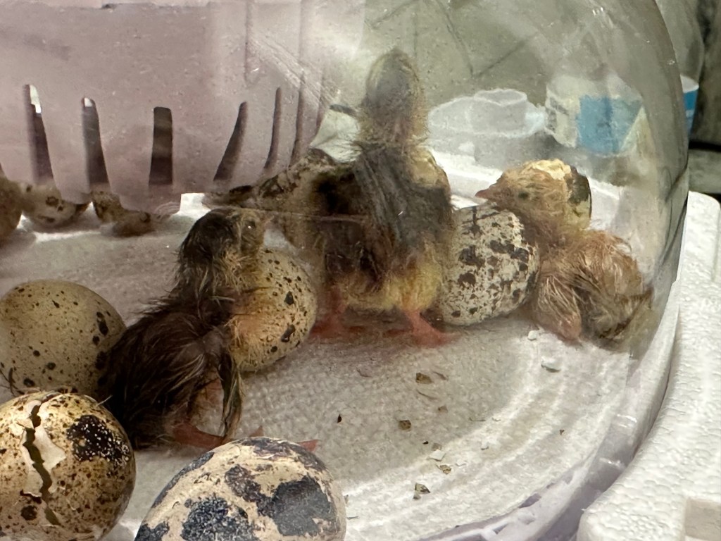 Quail eggs incubate faster than most poultry — Just 18 days! We made sure the temperature stayed around 99.5 degrees and humidity above 65%. Our incubator automatically turned the eggs every 90 minutes until lock down on day 15.