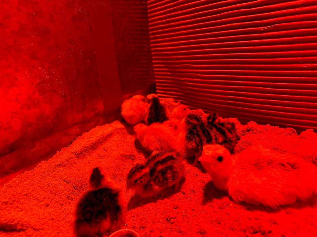 The one-day old baby turkey poult heat lamp bathing with our baby quail!