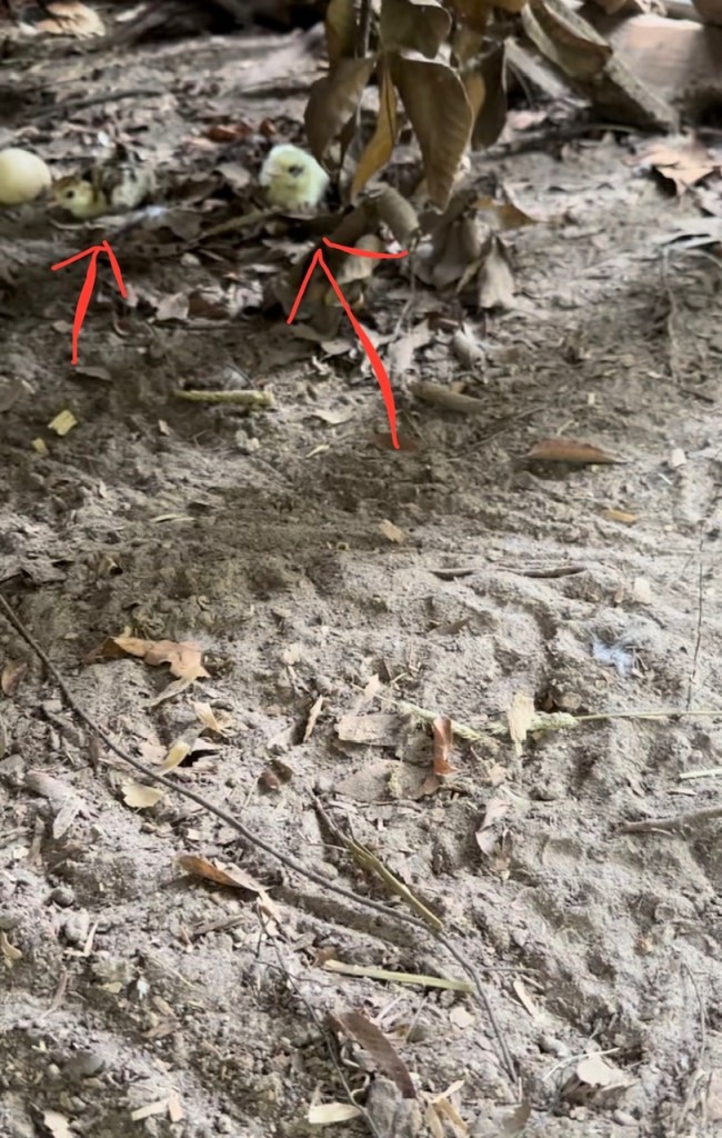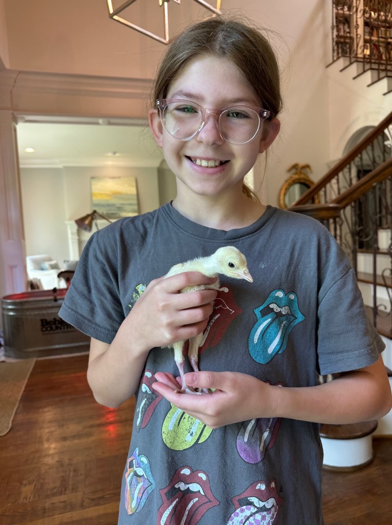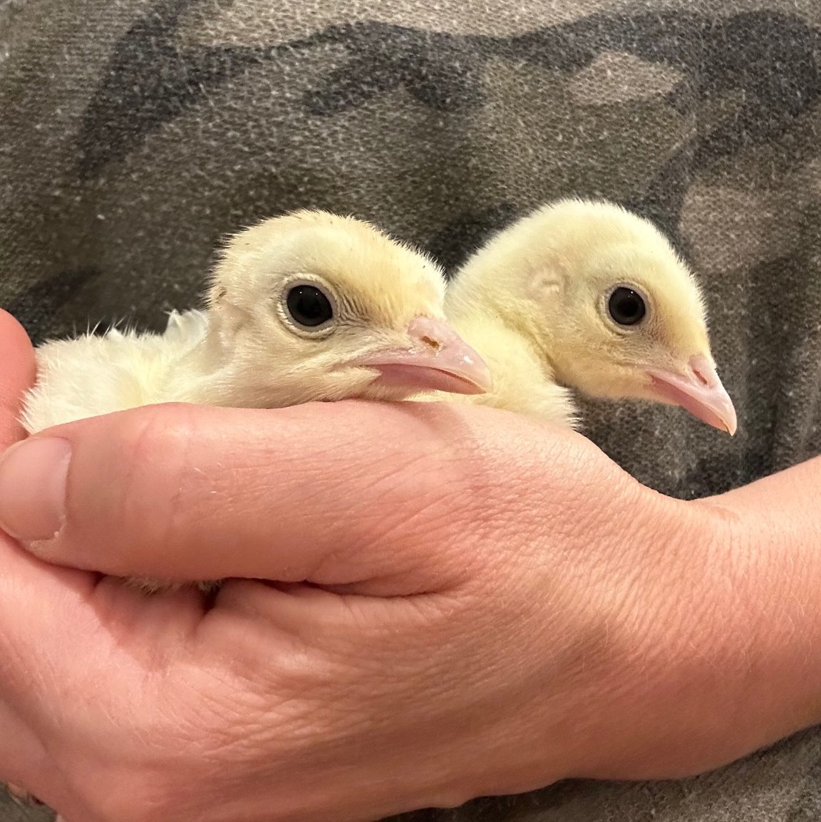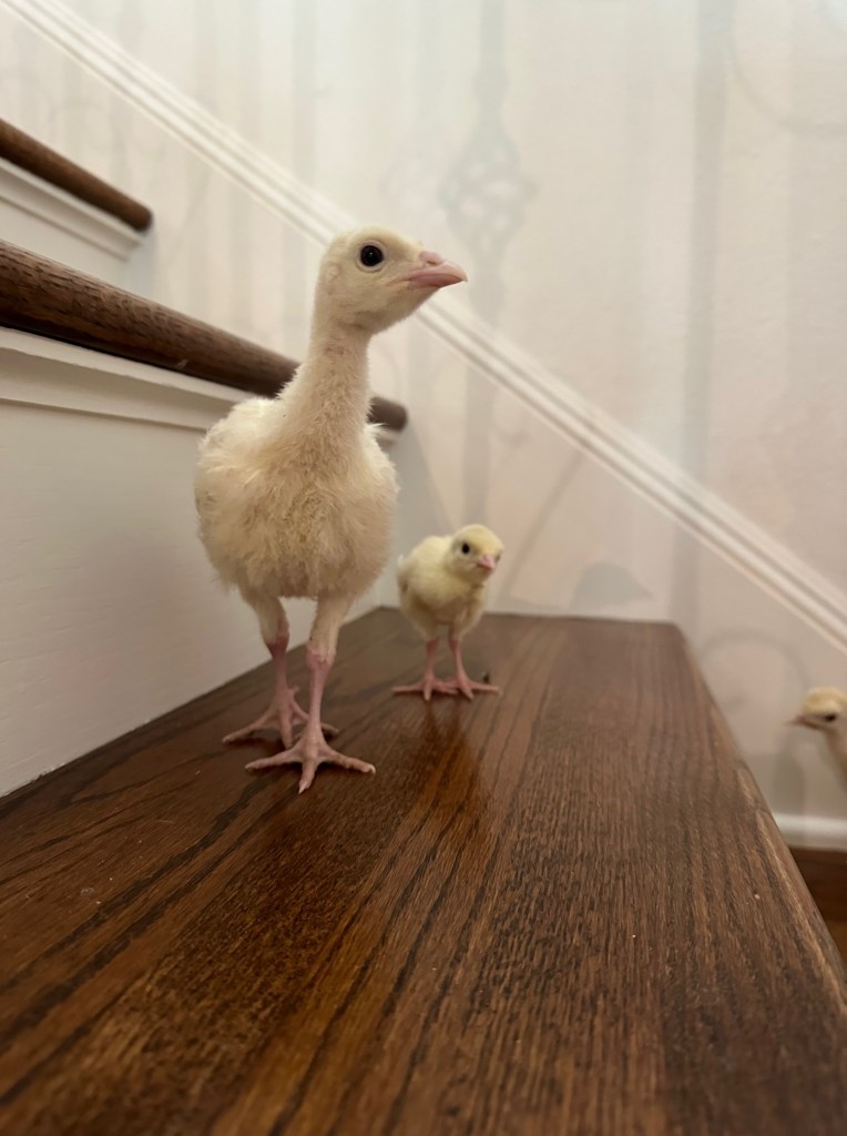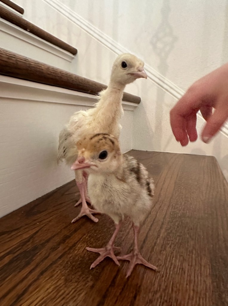 Two surviving Rio poults hatched by their mother. We brought these poults home to keep them safe. Betsy named them “Miley Spears” and “Mrs Blueberry”
