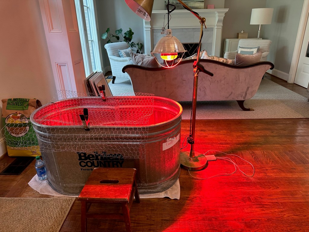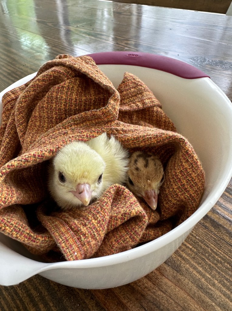 The two surviving turkey poults we found in the turkey pen staying warm in a bowl and ready for the car ride to Dallas