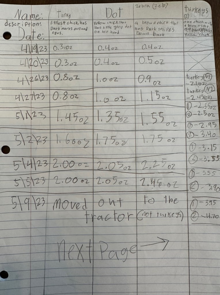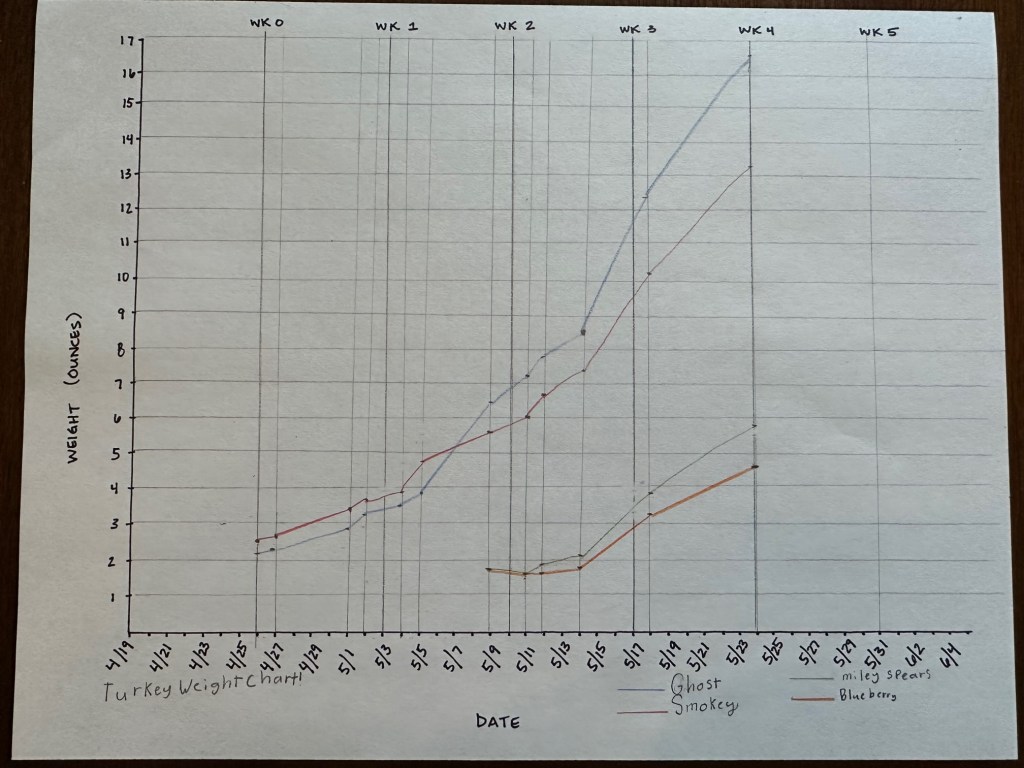 I finalized my weighing and made a line graph to show their weight gain The turkey poults are currently living in a rabbit hutch in our dog run at home. Soon they will move into the turkey pen at the ranch. The adult Rios have been set free but they have chosen to stay near their old pen.